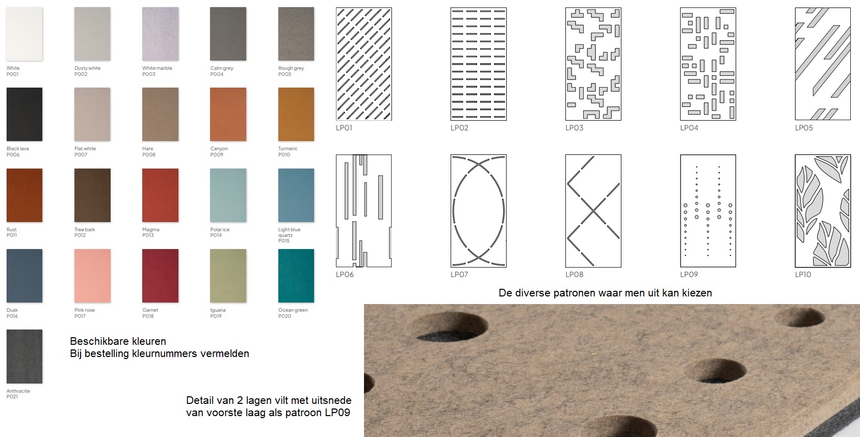 Set van 4 gekleurde akoestische panelen in een vaste maat van 118x58 cm waarmee simpel en snel grote muuroppervlakken bekleed kunnen worden. De 18 mm panelen bestaan uit 2 lagen PET-vilt van 9 mm in gelijke of verschillende kleuren. In de voorste laag wordt patroon LP09 uitgesneden (hierbij heeft u keuze uit 10 patronen). hierdoor wordt de achterste laag goed zichtbaar, wat zorgt voor een fraaie combinatie van 2 kleurlagen of een een 3-D effect bij 2 lagen met dezelfde kleur. U heeft keuze uit 10 verschillende kleuren. Bij bestelling gewenste kleur vermelden. Zie voor kleurkeuze de bijgevoegde kleuren PDF. De zijkanten van de panelen zijn afgewerkt met een bevel-cut. Passtukken zijn op locatie eenvoudig met een mes en snijlineaal op maat te snijden. De akoestische panelen bestaan uit 100% recyclebaar polyethyleentereftalaat (PET) waarvan een deel komt van gerecyclede PET-flessen. Deze materialen worden verwerkt tot een geluidsabsorberend vilt met een zachte structuur. Het PET-vilt is door-en-door gekleurd. Bij de creatieve uitsnedes is de kleur ook in de uitsnede zichtbaar. We hebben 21 kleuren geselecteerd, met sterke vertegenwoordiging in grijstinten en bruintinten. De panelen zijn voorzien van klittenband montage. Dit heeft als voordeel dat de panelen snel en simpel te monteren zijn, hergebruikt kunnen worden en dat materialen in de toekomst te scheiden zijn. Op aanvraag kunnen we panelen ook zonder klittenband leveren voor verlijming aan de wand. Akoestische waarde van de 18 mm panelen is: NCR = 0,5. Brandwerendheid: EN 13501 B-s1.d0. Bij bestelling gewenste kleur van het akoustisch vilt vermelden.