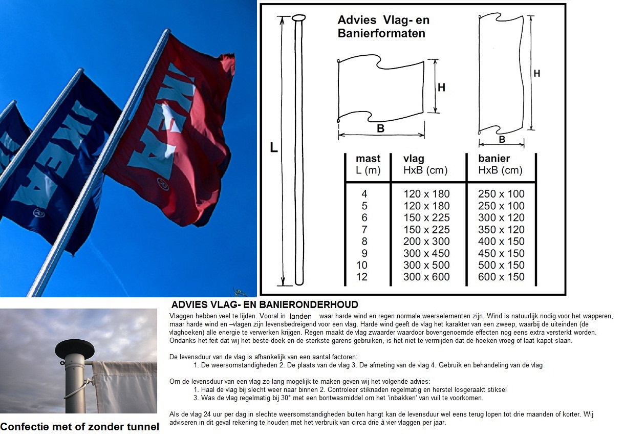 Digitaal druk via dubbelzijdige spray, UV bestendig, 100% doordruk, van 3-draads geweven glanspolyester vlaggendoek, ca. 110 gr. Met de techniek van dubbelzijdige spray benaderen we techniek van zeefdruk met het voordeel dat het milieutechnisch gunstiger is. Met digitale spray aan een kant en spiegelbeeld spray aan de andere kant realiseren we aan beide kanten van de vlag een even krachtige kleur. Bij deze techniek vragen wij indien bekend ook de PMS kleuren van het drukbestand op zodat wij die kleuren digitaal zo goed mogelijk kunnen benaderen. De vlag wordt verder volledig geconfectioneerd, rondom gezoomd en indien gewenst aan de bovenzijde voorzien van een open zoom t.b.v. uithouder/galg en aan de mastzijde voorzien van kopband en clips. Printklaar PDF-bestand aanleveren op basis van de afmeting van de vlag. Tegen meerprijs kunnen wij die ook voor u opmaken.
