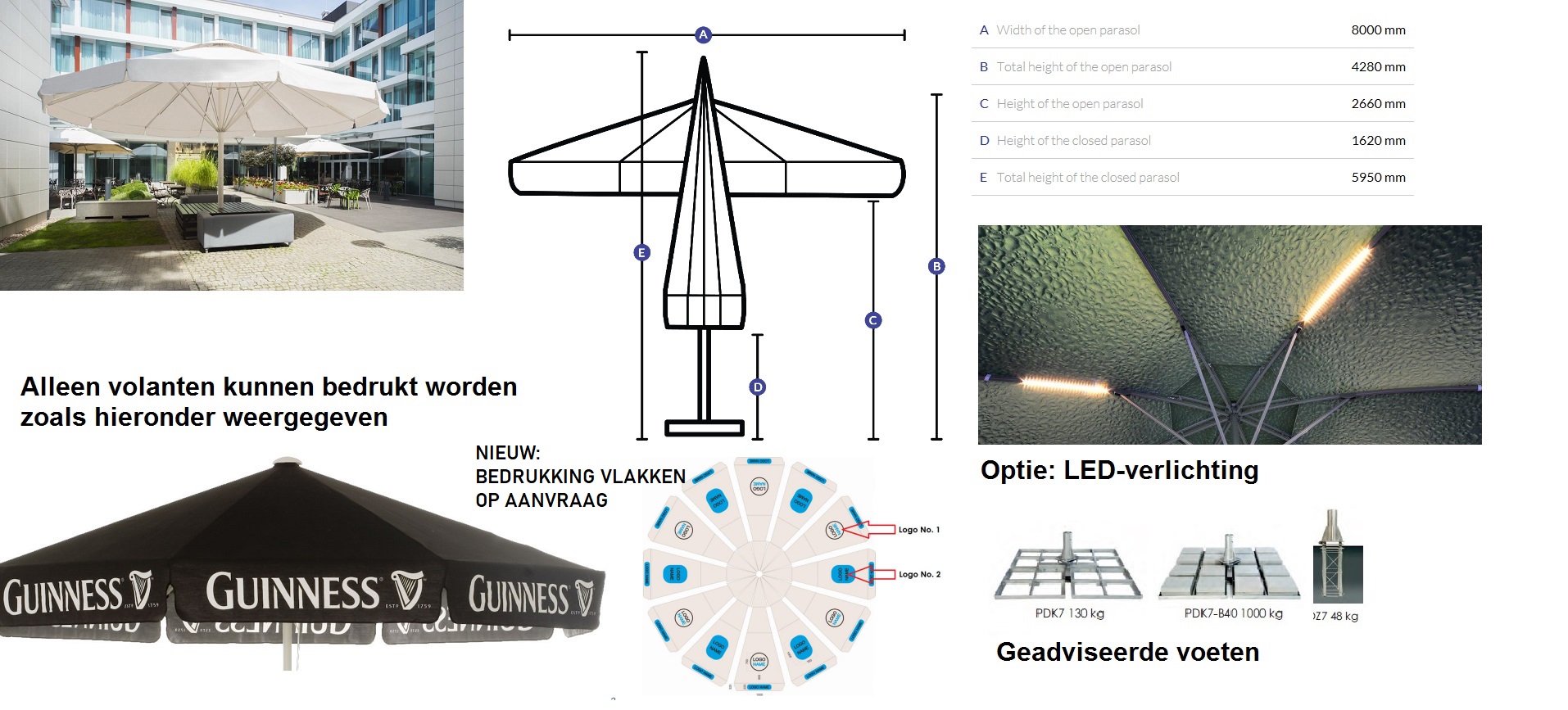 Hoogwaardige zeer sterke professionele parasol met volants waarbij alleen deze volants voorzien zijn van een digitaal full colour print met een hoge UV resistentie voor een langdurig behoud van kleuren. Bedrukking van de volants moeten gelijk zijn. Doek is van 280 grams gecoat parasoldoek (100% polyester, waterproof) en rondom afgewerkt. Door de coating wordt zowel water alsook het vuil door het doek afgestoten. Afmetingen zie afbeelding. Uitgevoerd in wit (RAL 9016) met een versterkte centrale staander met een diameter van 139,5 mm. Frame heeft 12 versterkte armen van 70x18mm die dubbel ondersteund worden. Gemakkelijk hijssysteem met hendel (zie afbeelding). Exclusief parasolvoet; aanbevolen voor deze uitvoering PDk7 en de bodemhuls PDZ7. Zie voor keuze parasolvoet bijlage en voor prijs hiervan zie bij parasolvoet. Optie tegen meerprijs: LED-verlichting op 8 armen van elk 50 cm lang. Bij grotere aantallen prijs op aanvraag. drukklaar bestand aanleveren. Tegen meerprijs kunnen wij deze ook voor u opmaken.